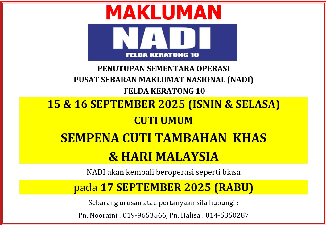 Tarikh 07 September 2025 Masa 10.00 pagi hingga 5.00 petang Tempat NADI Felda Keratong 10 Tujuan Program Khas Merdeka & Hari Malaysia NADI Felda Keratong 10 Aktiviti Pelbagai aktiviti disediakan pada 07 September 2025. Antaranya ialah :– pendaftaran ahli baru– […]